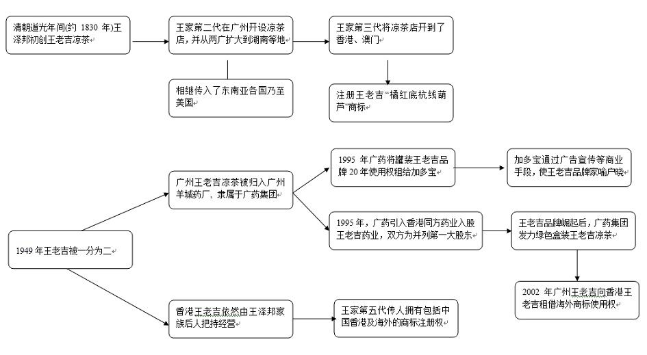 1997年,广药旗下的广州羊城药业股份有限公司王老吉食品饮料分公司与香港鸿道集团有限公司签订了商标许可使用合同,合同规定,鸿道集团有限公司自当年取得独家使用“王老吉”商标生产销售红色纸包装及红色铁罐装凉茶饮料的使用权,合同有效期至2011年12月31日止,有效期15年。而广药下属企业王老吉药业则自主生产销售绿盒装王老吉。