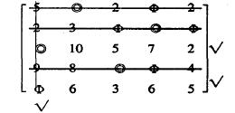 先在第五行旁打√,接着可判断应在第一列下打√,接着在第3行旁打√,经检查不能再打√了.对没有打√行画一直线以覆盖0元素,对打√的列画一直线以覆盖0元素,得: